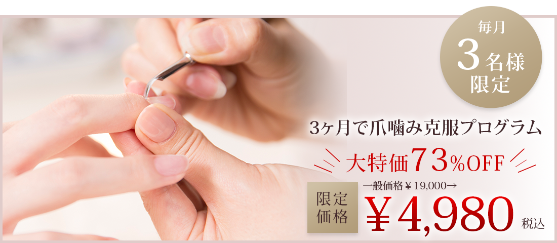 爪を噛むことをコントロールするための習慣と誘因を特定し、自覚し代替行動を提案しながら3ヶ月で爪噛みを克服する独自のプログラムです。